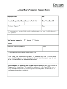 Utilizing such a form offers numerous advantages. It clarifies expectations, reduces misunderstandings, and promotes fair and transparent leave management. Clear documentation helps prevent conflicts, simplifies payroll processing, and aids in workforce planning. Furthermore, it ensures compliance with company policies and relevant labor laws.