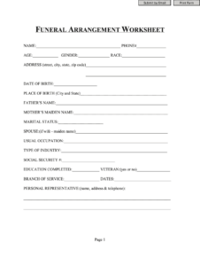 Utilizing such a form offers significant advantages. It simplifies the process for bereaved families by providing clear instructions and minimizing potential disputes. Furthermore, pre-planning allows for cost analysis and potential pre-payment, which can alleviate financial strain and provide peace of mind. Finally, documenting these arrangements ensures personal preferences are honored, contributing to a meaningful and personalized farewell.