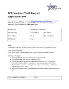Utilizing such a framework offers numerous advantages. For applicants, it simplifies the process, clarifies expectations, and reduces the likelihood of errors or omissions. For program administrators, standardized applications streamline review and selection, enabling more objective and equitable evaluation of candidates. A well-designed template also ensures consistent data collection, facilitating analysis and reporting on program demographics and outcomes. This structured approach can ultimately lead to a more effective and impactful youth development program.
