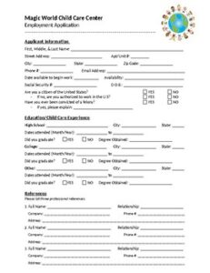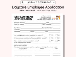 Utilizing a structured form streamlines the hiring process, saving time and resources for the childcare center. It ensures that all necessary information is gathered from each applicant, facilitating a fair and objective comparison of candidates. Furthermore, a well-designed form helps to protect the center from legal liabilities by ensuring compliance with relevant regulations and background check procedures. This ultimately contributes to a safer and more nurturing environment for the children.